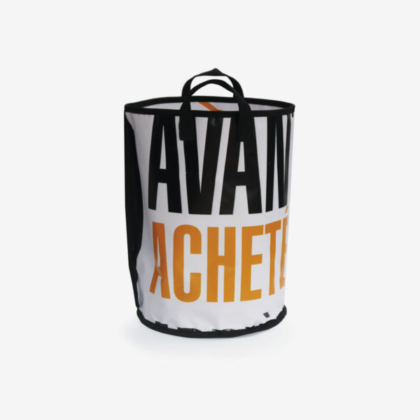 Blanche avec ses textes orangés, mais surtout pratique et utile, cette corbeille en bâche publicitaire recyclée, s’adapte à tout ! Fourre-tout ou sac à linge, ses poignées vous permettent de passer d’une pièce à l’autre avec facilité. Son visuel unique et son éco-design abouti apporte à vos intérieurs une touche écolo originale ! Entièrement fabriquée en France par un atelier favorisant la réinsertion sociale … et hop l’affaire est dans le sac !
