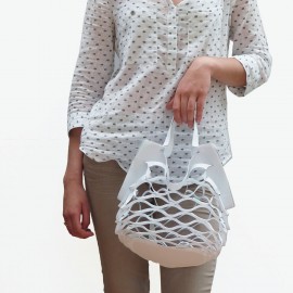 Ce sac filet en bâche publicitaire recyclée va vous étonner ! Par un simple jeu de découpe, une fois rempli ce petit carré imprimé sans couture se transforme en un filet véritable compagnon de vos shopping. Discrètement glissé dans votre sac à main, ce Sakafilet saura se montrer indispensable pour vos emplettes et il vous accompagnera partout. Vous allez faire sensation ! Un détournement réussi et un upcyling assuré en France, par des ateliers favorisant la réinsertion sociale. Remplissage de pommes bio conseillé.