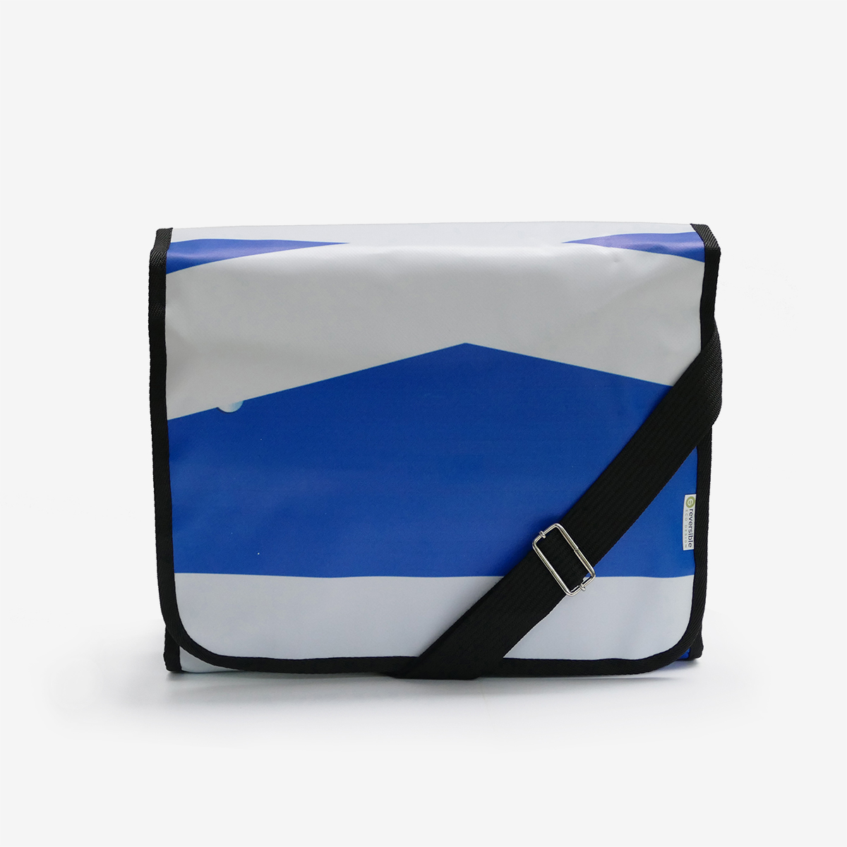 Avec cette Sacoche en bâche publicitaire recyclée bleue et blanche, vous pourrez balader dossiers et ordinateur à pied ou à vélo. Ce sac de cours vous donne un look qui va faire des envieux. Portée à l’épaule ou en bandoulière, mode et développement durable vont de pair … Affichez vos valeurs. Chaque exemplaire est unique. Un détournement réussi et un upcyling assuré en France, par des ateliers favorisant la réinsertion sociale. Votre esprit écolo va en épater plus d’un !